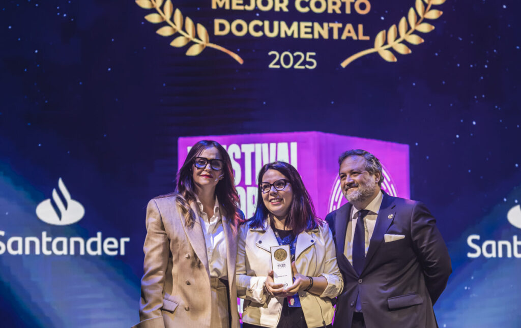 El siguiente galardón fue el de la categoría Documental. Patrocinado por Banco Santander, fue el director de Instituciones Privadas y Religiosas de la entidad, Eduardo Pomares, el encargado de desvelar el nombre del ganador. ‘Historias en la piel’, de Noelia Caravaca Expósito, fue el corto elegido por el jurado. Una obra audiovisual que visibiliza el trabajo de la enfermería en la etapa posterior a la superación de un cáncer de mama.